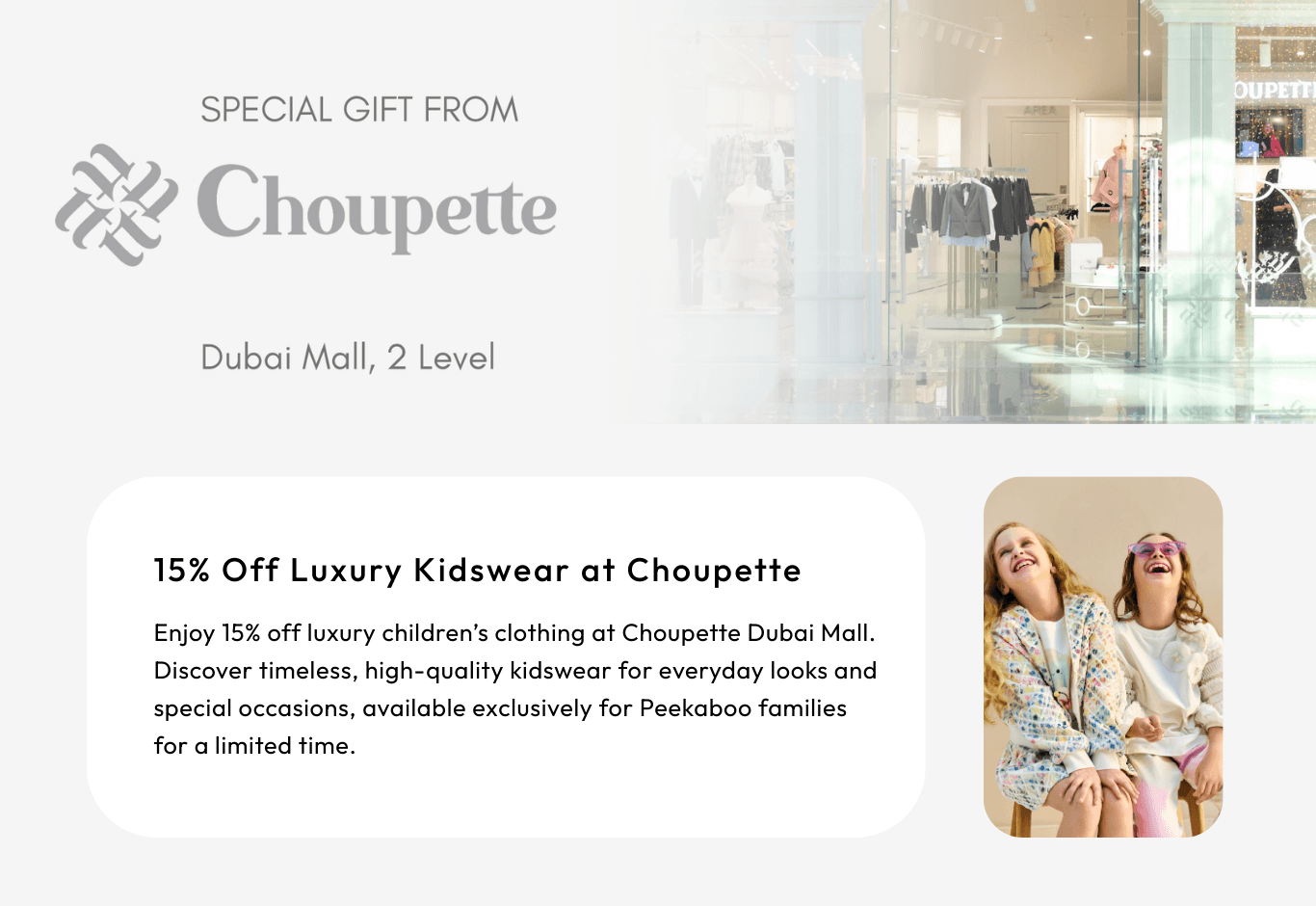 This offer is available exclusively to Peekaboo families. The 15% discount is valid for in-store purchases at Choupette Dubai Mall only and applies to full-priced items.